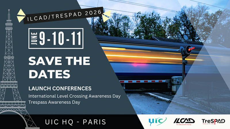 UIC is delighted to invite you to the international launch conferences of the 18th edition of Level Crossing Awareness Day (ILCAD) and the 5th edition of Trespass Awareness Day (TRESPAD) taking place in person, in English and French, at the UIC headquarters in Paris on 9 and 10 June 2026.