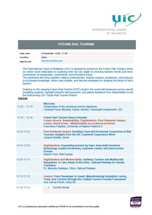 Drawing on the ongoing Future Rail Tourism (FRT) project, the event will showcase survey results and modelling analysis, highlight industry best practices, and gather feedback from stakeholders to inform the forthcoming UIC Future Rail Tourism Report.