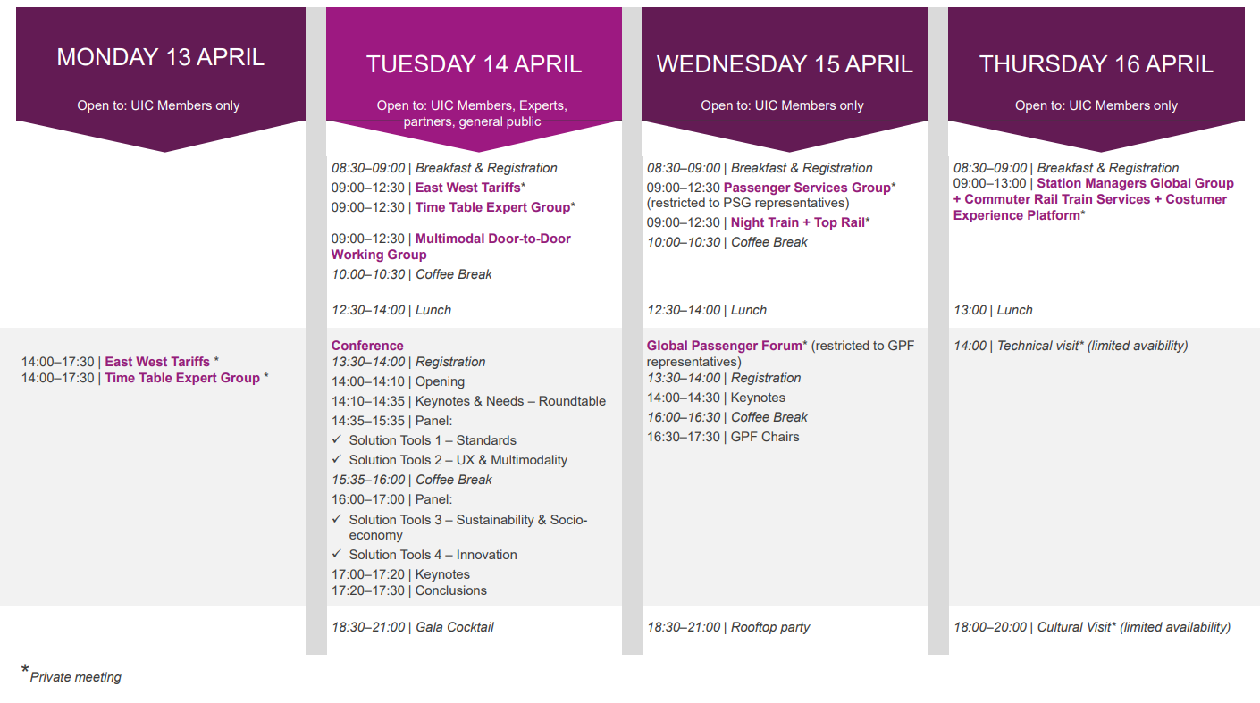 The final two days will be restricted to the Passenger Services Group (PSG) and the Global Passenger Forum (GPF), which are key governance and strategic meetings for UIC passenger activities.