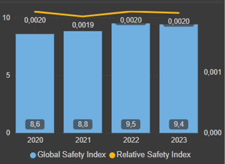 Since 2020, a year heavily impacted by the COVID-19 pandemic, there has been a sustained increase in significant accidents1. This rise was evident both in absolute numbers and relative to train-kilometre ratios. However, despite this increase, there was a slight decrease in the Global Safety Index (GSI), indicating a positive trend towards overall safety improvements.