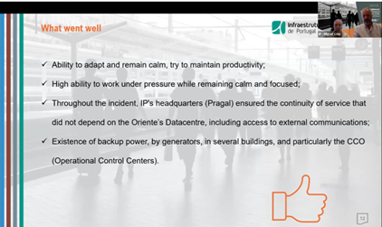 The discussions highlighted the railway system’s resilience, built on a solid foundation of existing technical preparedness, while also underscoring the importance of human factors and the commendable performance of staff in the face of such an exceptional and extreme event. At the same time, the value of the lessons learned was emphasised, along with the need to reinforce certain protocols and actions to further strengthen the capacity to respond to large-scale disruptions, such as: