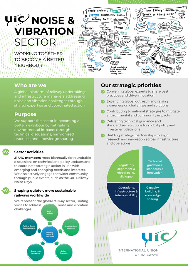 The UIC Noise and Vibration Sector supports the railway community by facilitating knowledge transfer, coordinating research, and engaging with policymakers and stakeholders focusing on: